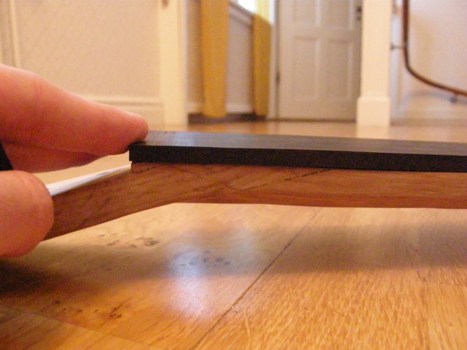 Today the fretboard have been planed once more, I have also shortened it so that it have got the correct length. The thickness of it is as you can see below.